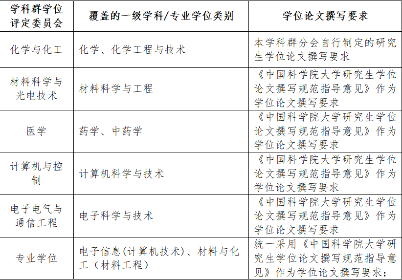 中国科研实验室大学学科群学位评定委员会与学科专业及学位论文撰写要求对应表